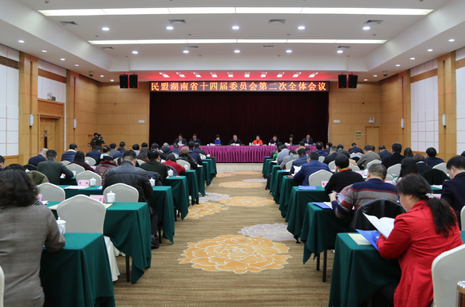 民盟湖南省第十四届委员会第二次全体会议于2018年2月1日在长沙召开。省人大常委会副主任、民盟省委主委杨维刚,省政协副秘书长、民盟湖南省委专职副主委胡颖,副主委汤浊、何寄华、杨君武、戴晓凤、黎定军、赵为济出席会议,会议由胡颖主持。中共湖南省委统战部党派处处长洪真健,省发改委副巡视员王学力,省教育厅巡视员陈飞跃,省法制办党组成员、副主任张维杰和省统计局人事处处长曾斌求应邀出席会议。民盟省委委员、市州及省直基层组织主委、在湘民盟中央委员、担任全国和省“两会”代表、委员参加会议。会议学习了中共十九大精神和民盟十二大精神;传达了湖南省2018年“两会”精神;听取并审议了民盟湖南省第十四届常务委员会工作报告,通过了民盟湖南省十四届二次全体会议决议。