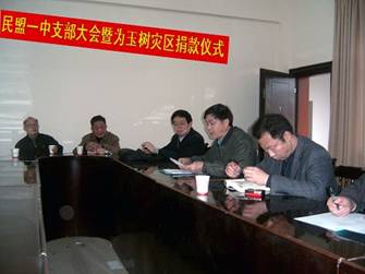 4月23日上午,常德民盟一中支部主委许克明来盟市委机关,将该支部盟员为玉树灾区捐献的1400元爱心款送到民盟机关干部手中。