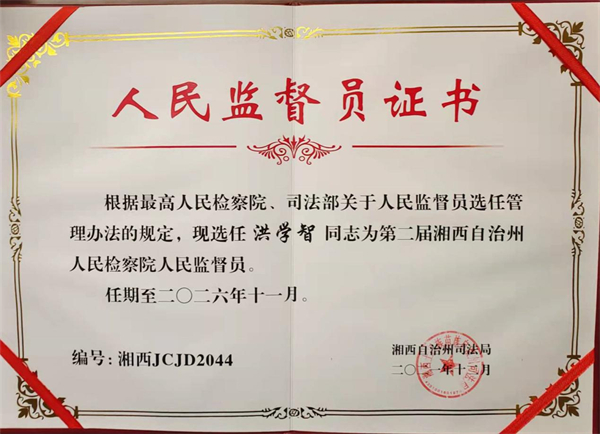 此次在全州共选任79名人民监督员,有机关干部、企业人士、院校学者、专业人士、普通职工、基层群众等,充分体现了群众性、广泛性、代表性和专业性。洪学智曾任花垣县政协委员,多年来充分发挥法律执业人员专业优势,围绕湘西州经济社会发展和党政中心工作积极建言献策,所提建议和提案获各级各部门采纳实施,多次荣获州、县各项表彰,参政议政能力得到行业内认可,是民盟湘西州委会优秀盟员。(民盟湘西州律协支部 洪学智)